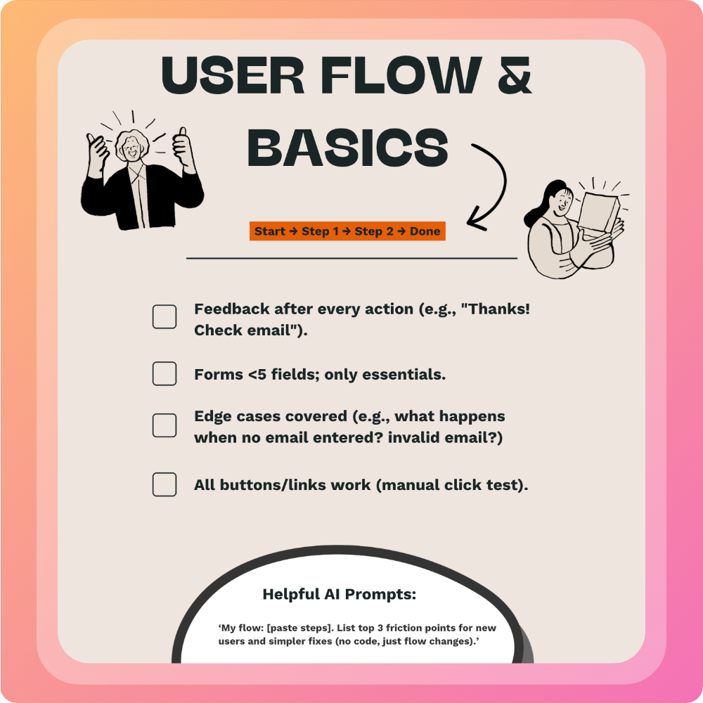 - Clear checklists for clarity, user flow, mobile, performance, safety, and polish—no jargon, just “do this / don’t do this” steps.